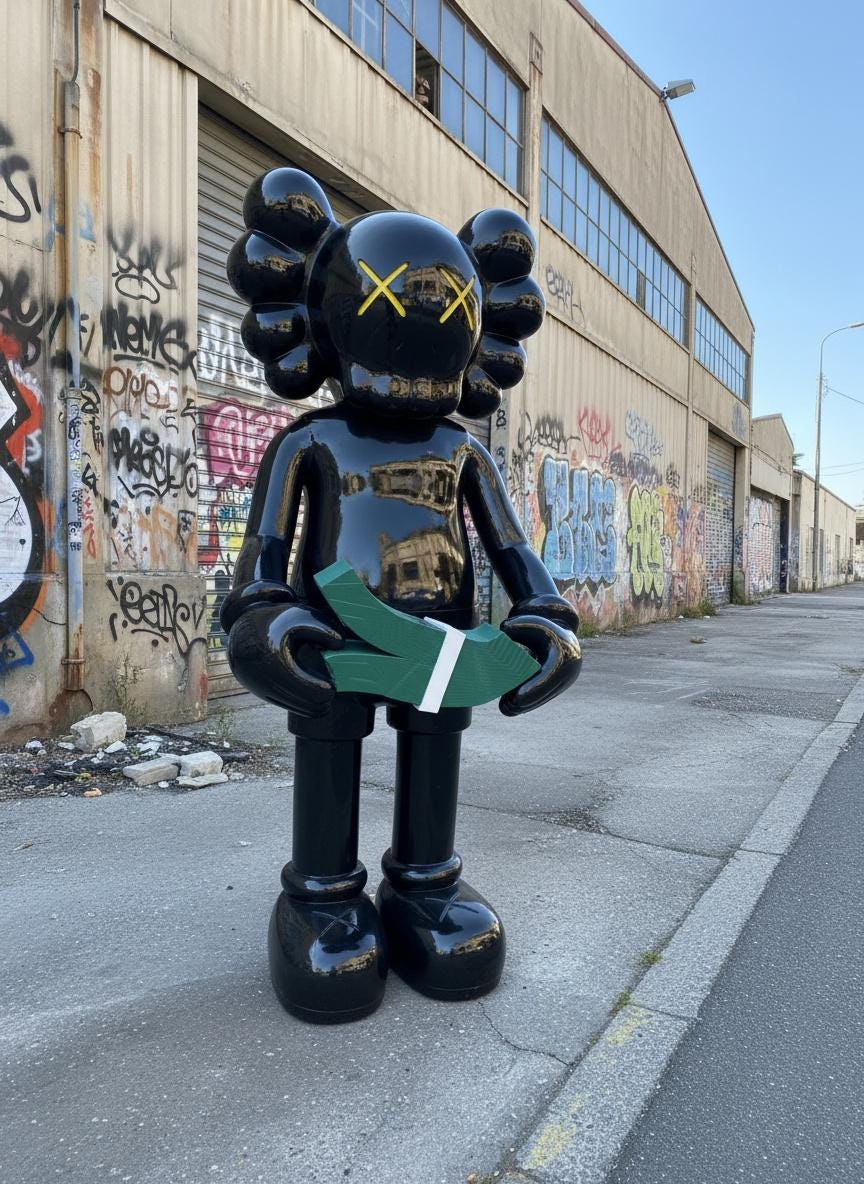 Make a bold and playful statement with this KCAWS Money Counting style statue, standing at 180 cm (6 feet) tall. Designed in sleek black, this sculpture captures the iconic KCAWS Companion in a humorous pose, holding a stack of money. Ideal for collectors, modern interiors, or street art-inspired spaces 🖤💸